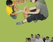 子供たちと作った紙芝居より大きい畳のような“壁芝居”をつなげて、青梅の民話「送り狼と迎え狼」のお話を朗読します。